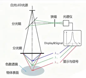 光譜共焦測量通過使用特殊透鏡,延長不同顏色光的焦點光暈范圍,形成特殊放大色差,使其根據不同的被測物體到透鏡的距離,會對應一個精確波長的光聚焦到被測物體上。通過測量反射光的波長,就可以得到被測物體到透鏡的精確距離。